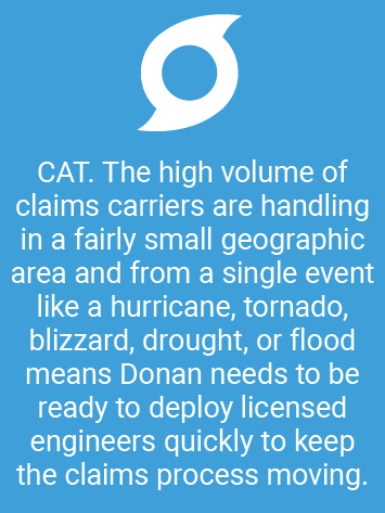 Donan has engineers licensed in all 50 states, so we’re able to handle your claims nationwide, but many engineers are licensed in multiple states. We focus on getting experts licensed in regions that are apt to experience hurricanes, flooding, and tornadoes, so experts can be reallocated where the need is greatest.